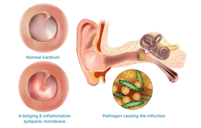 As the infection progresses, fluid builds up behind the eardrum. This fluid may be clear at first but can become thick and pus-filled as bacteria enter the middle ear.